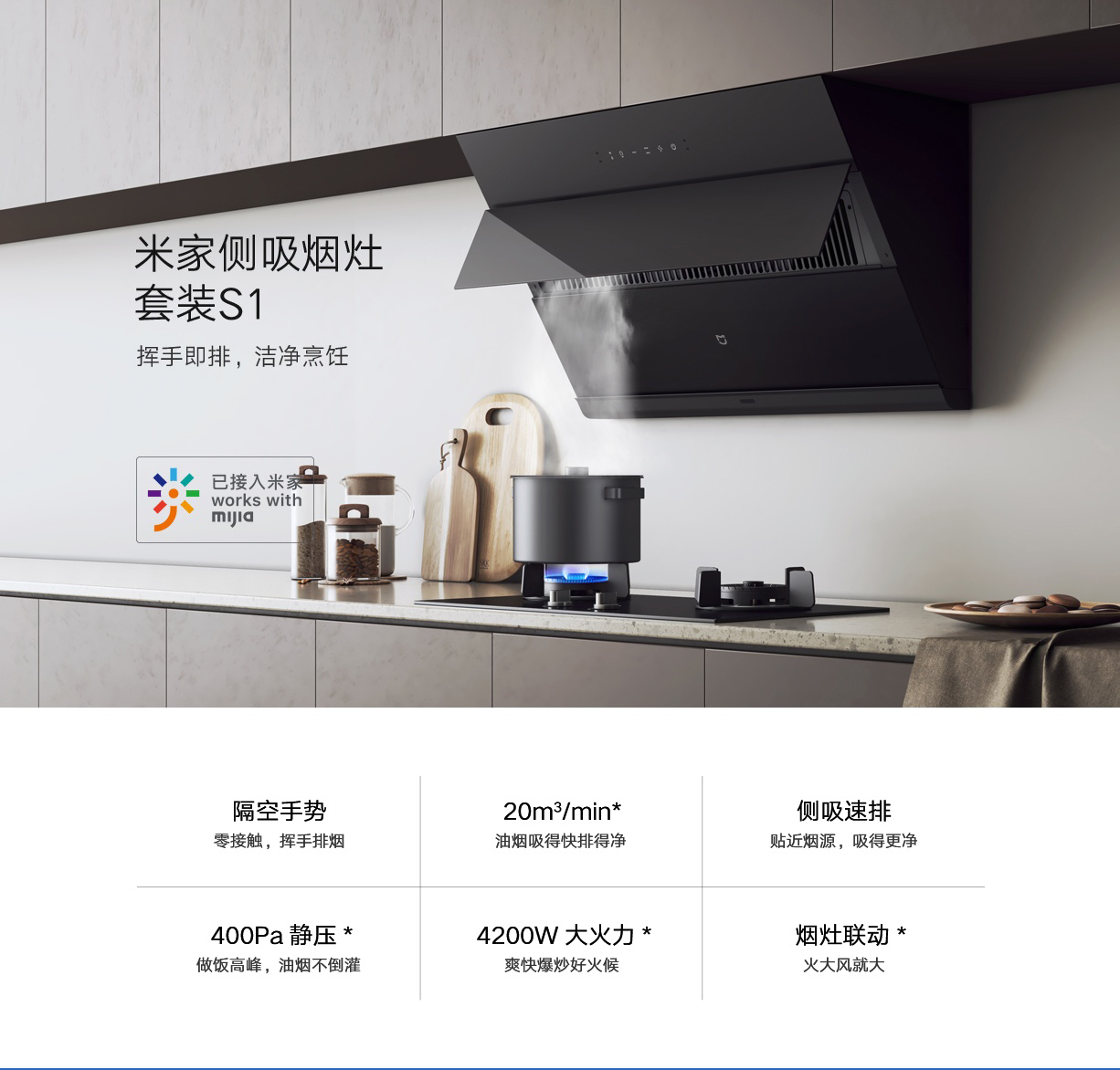 小米(MI)油煙機 米家互聯(lián)網(wǎng)煙灶套裝S1 油煙機灶具套裝 液化氣 天然氣油煙機燃氣灶 智能揮手感應 米家側吸煙灶套裝S1【4.2KW天然氣】